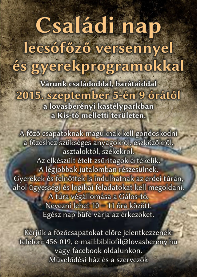Családi Nap Családi nap lecsófőző versennyel és gyerekprogramokkal 2015. szeptember 5-én 9 órától.Részletekért kattintson a képre!